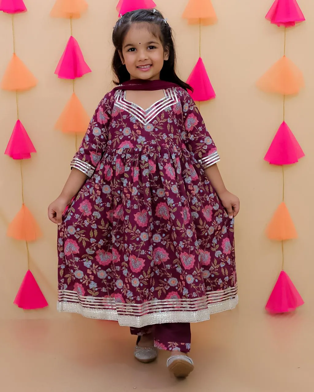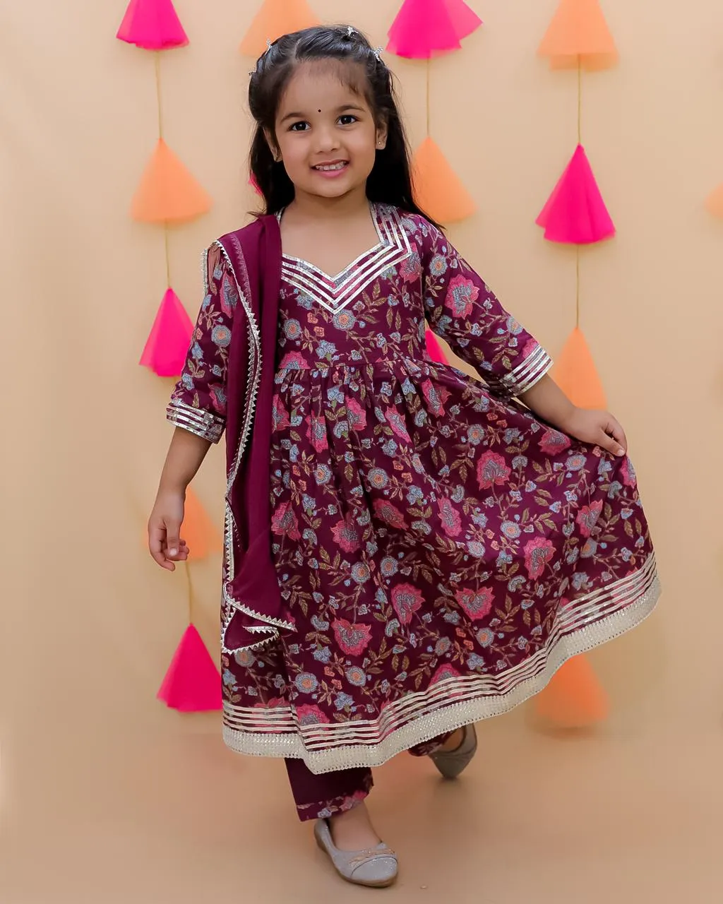 Floral printed long flared kalidar Kurti with 3/4th sleeves, hexagon neck with gotta detailing on the neck, sleeves and flared hem, paired with straight pants with elasticated waistband and chiffon dupatta