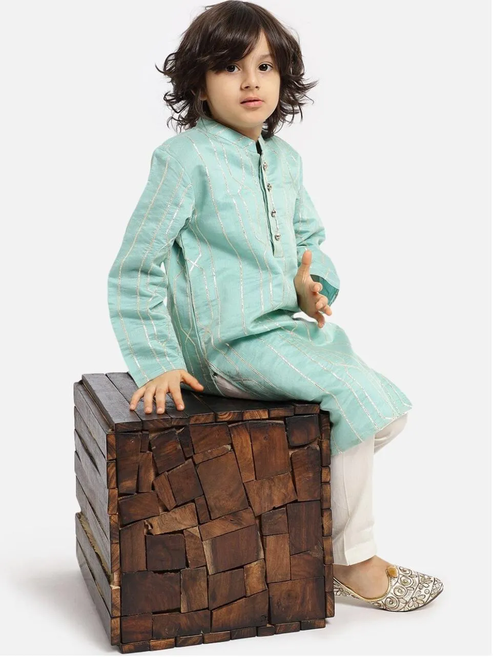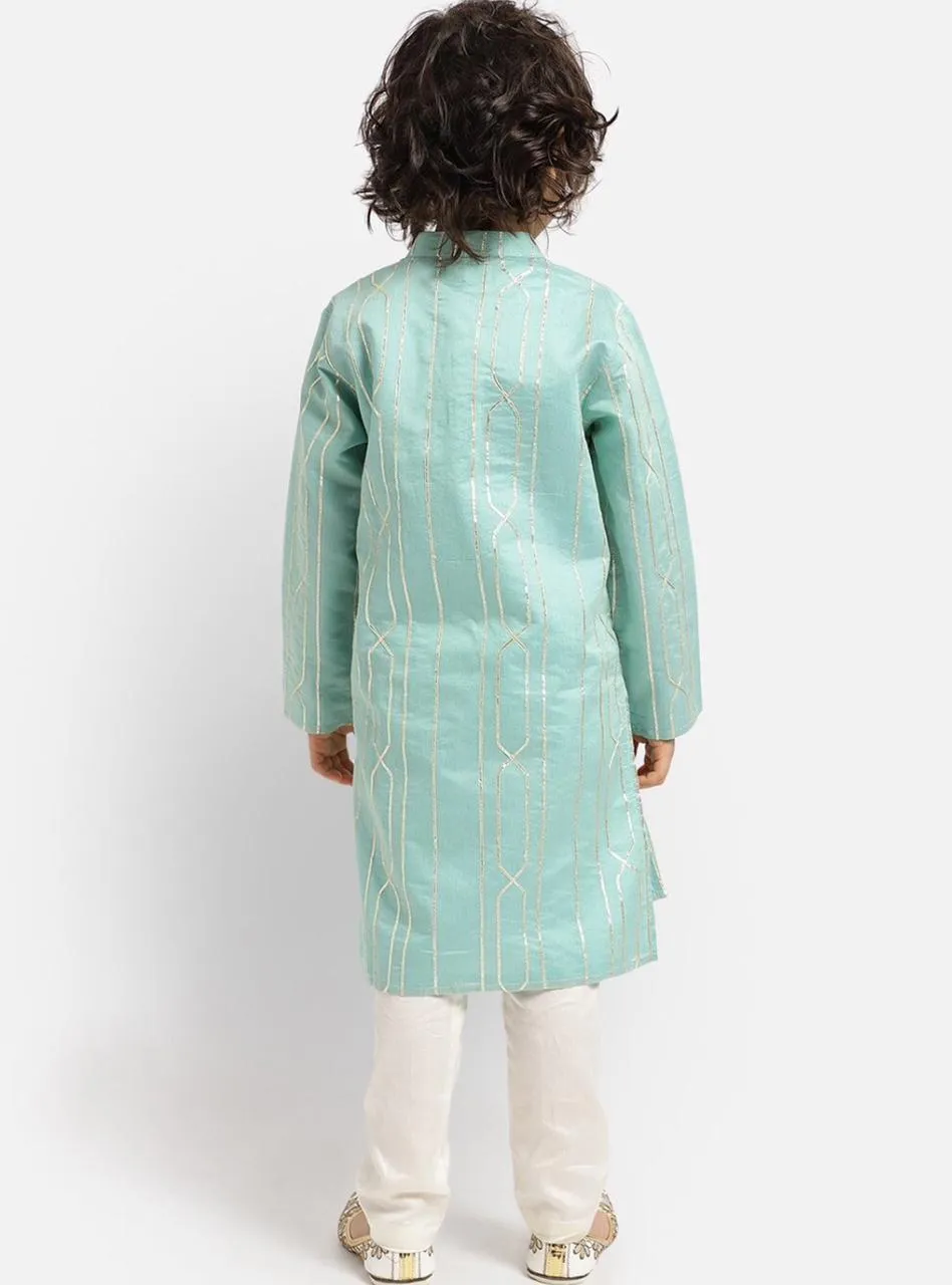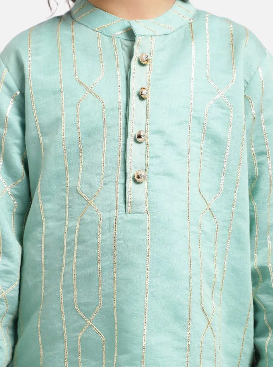 Solid gota lace detailed, straight shape, regular style kurta with mandarin collar and regular long sleeves with gota lace detail all over paired with solid pajamas with elasticated waistband