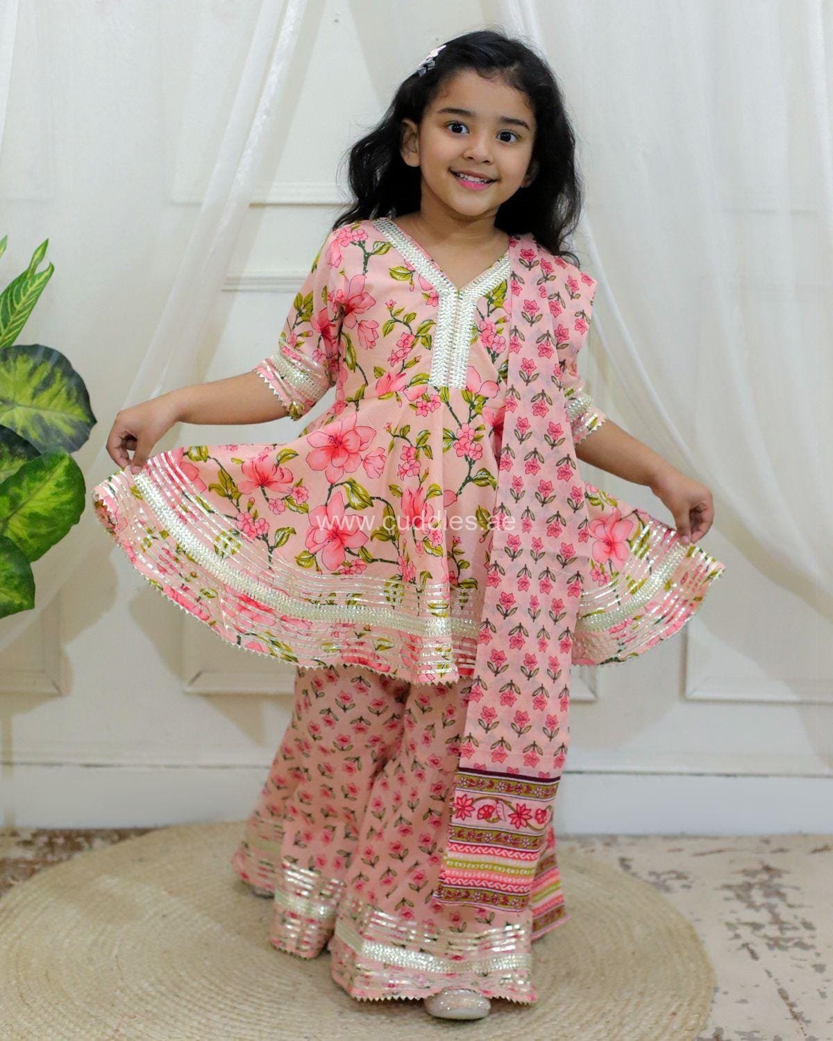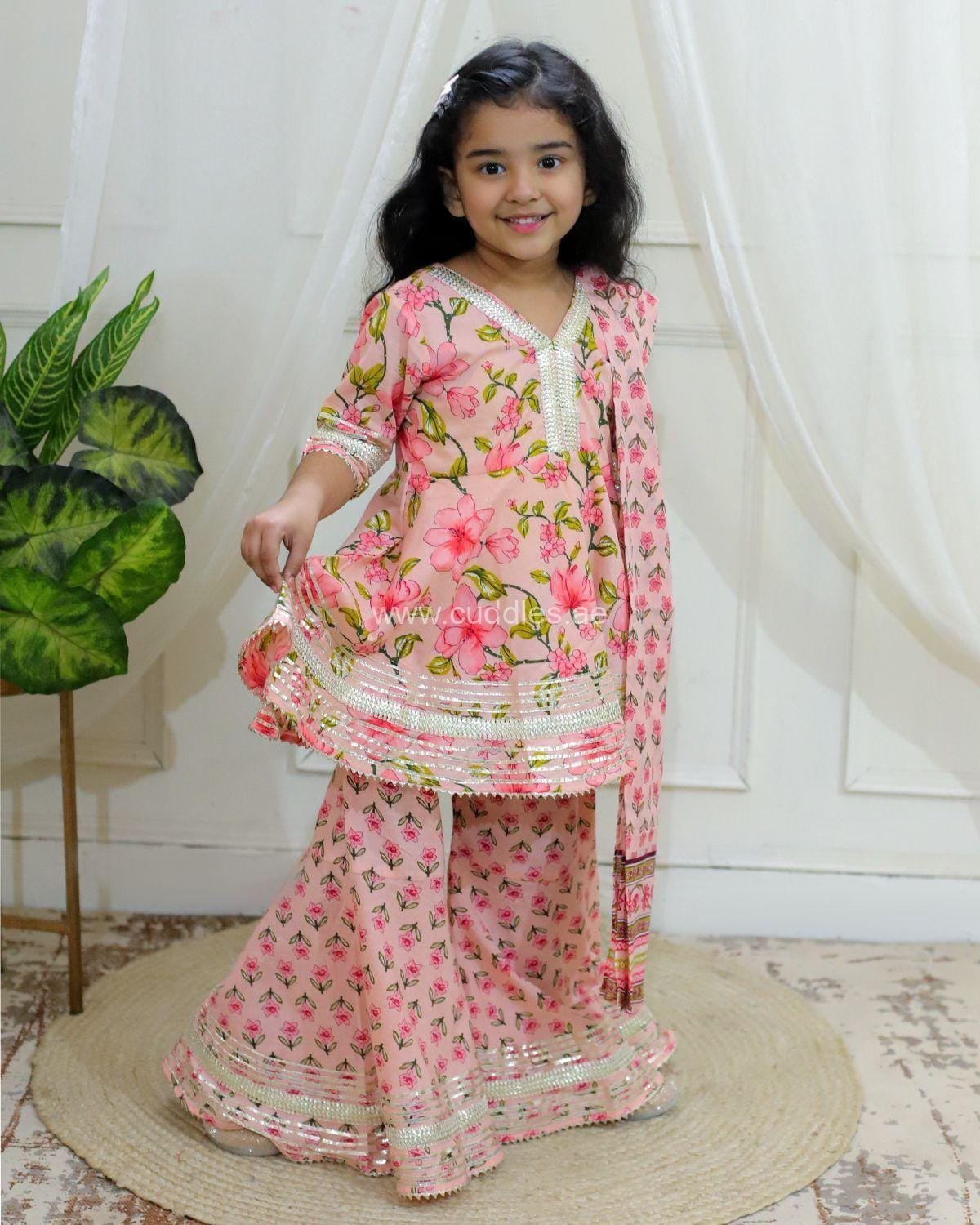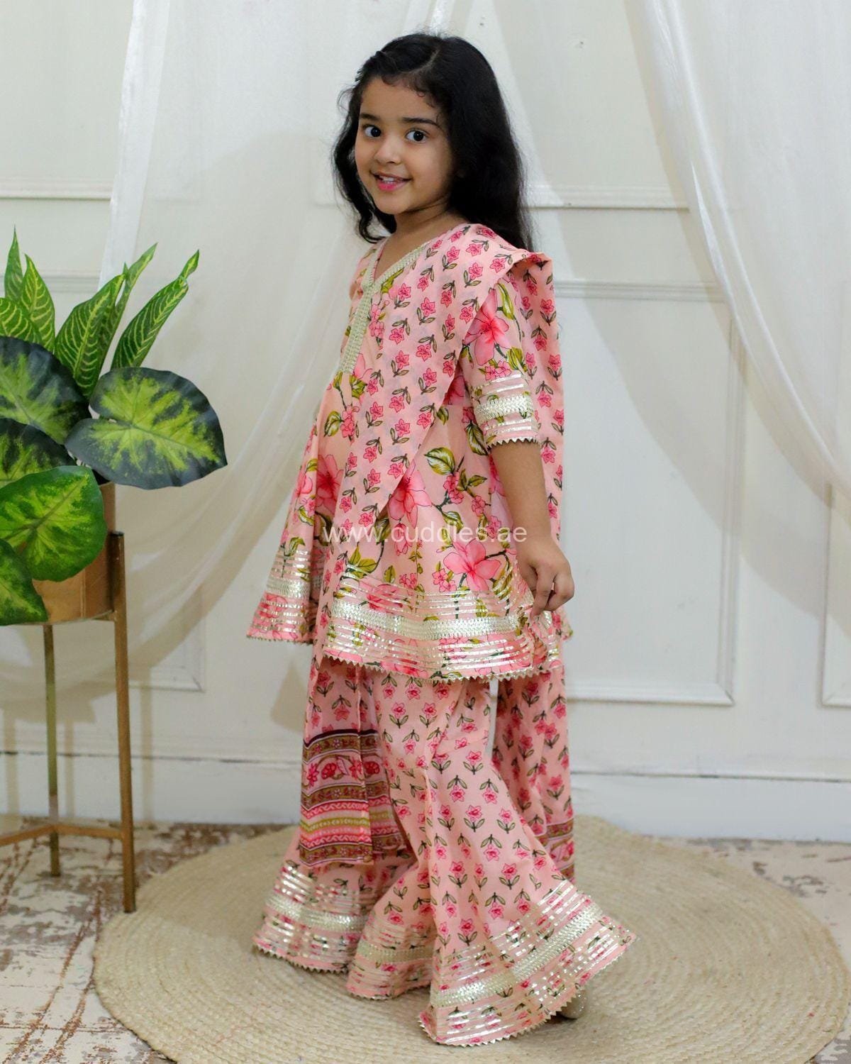 Very pretty 100% cotton V neck gotta embellished Kurti paired with Broad hem Sharara and printed Dupatta.