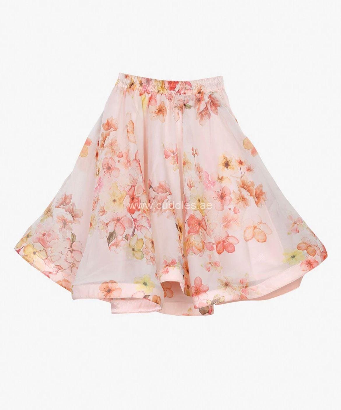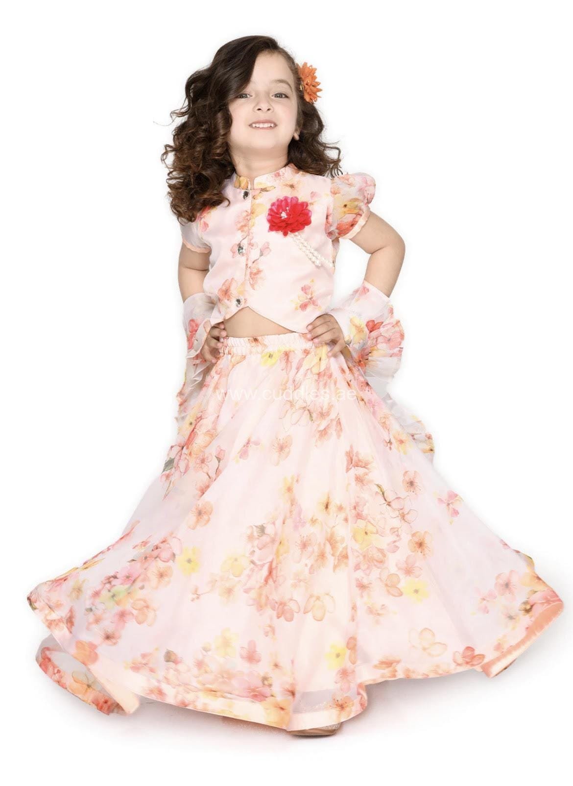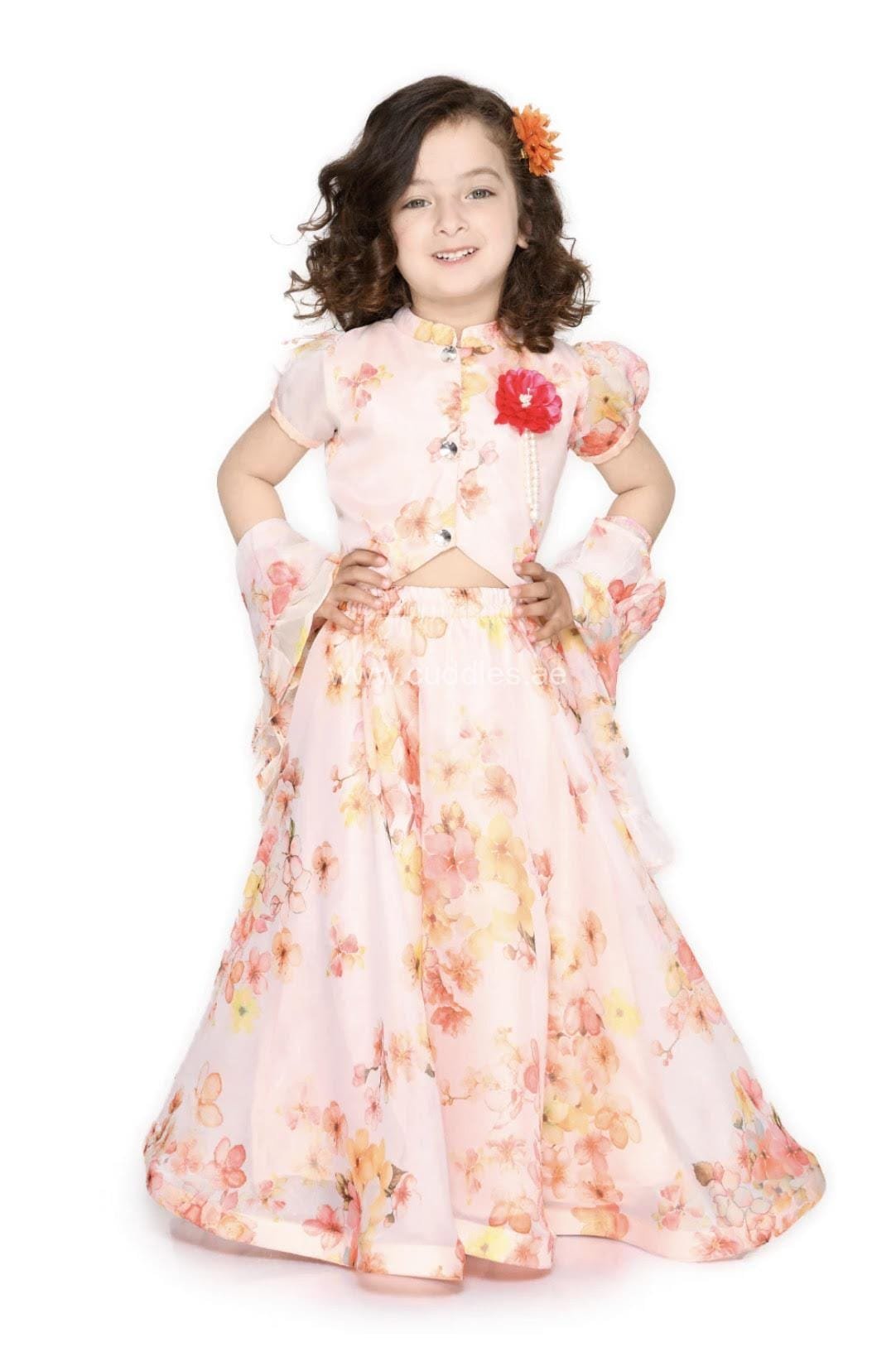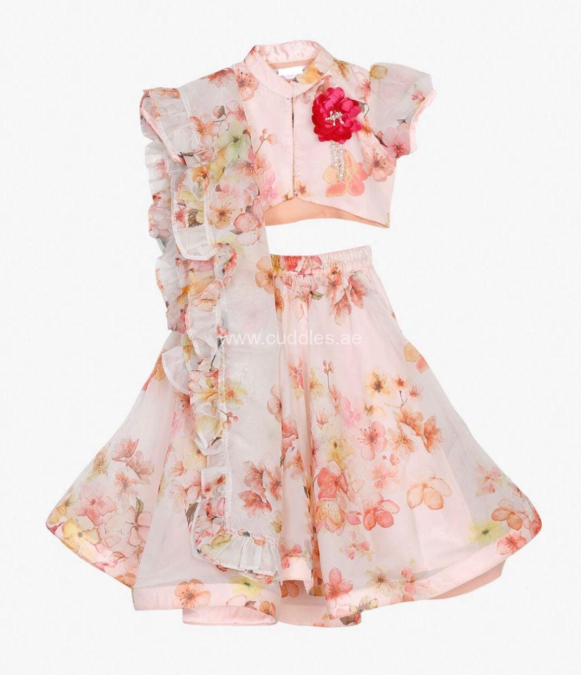Beautiful Peach Floral Lehenga Choli set with short sleeves front hook closure, flower embellished Choli and frilly Dupatta