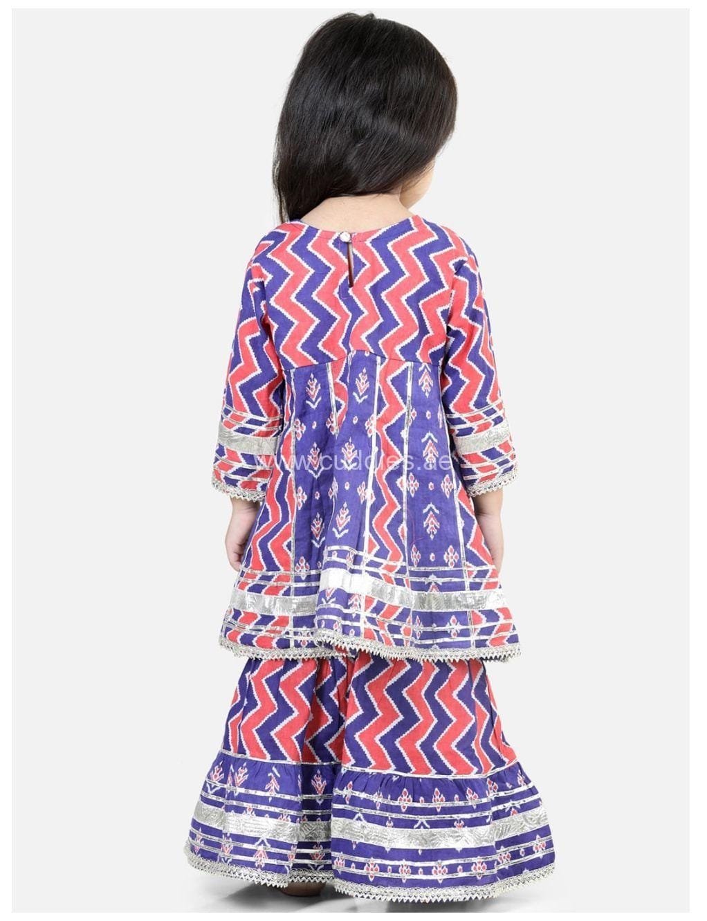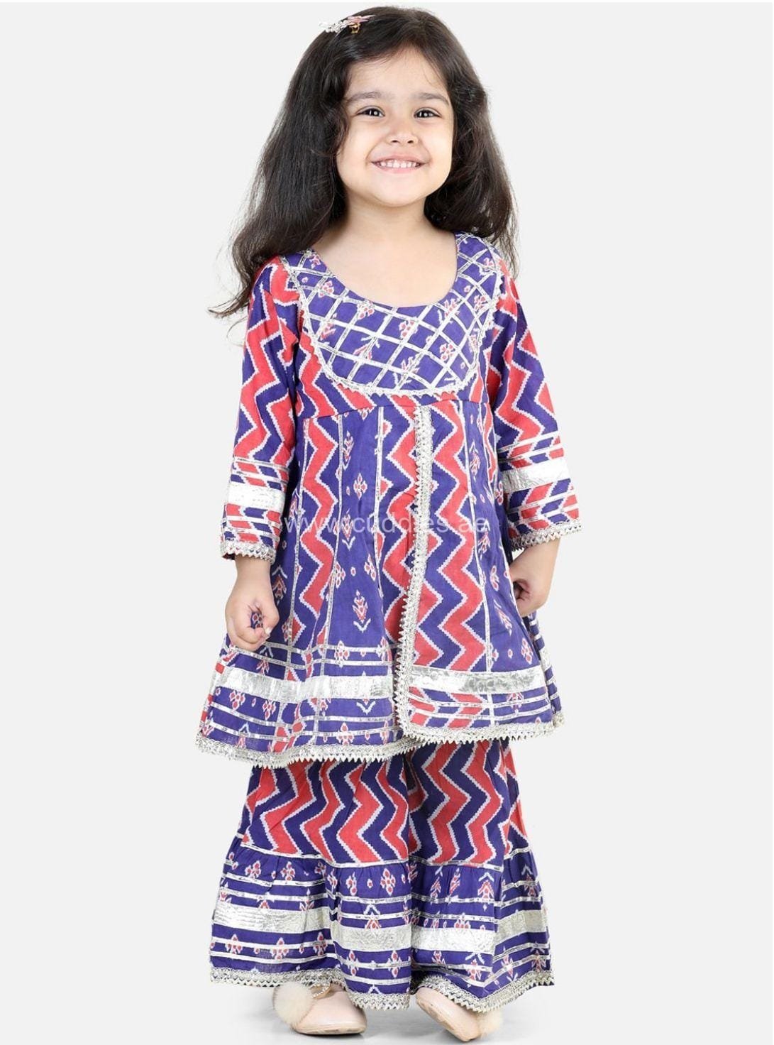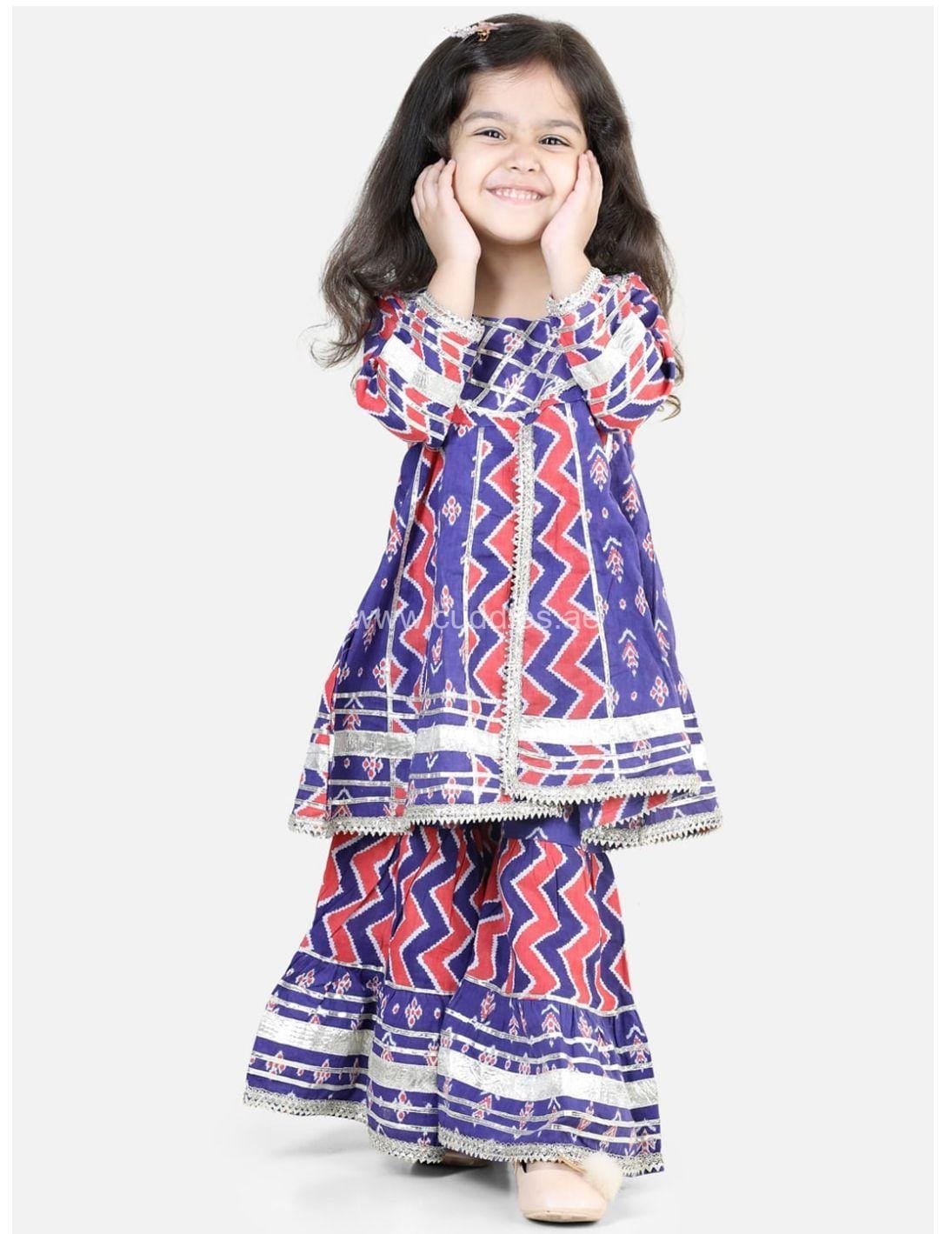 Pure cotton printed round neck, 3/4 th length sleeves, knee length, gota lace detailed Kurta paired with comfortable Sharara pants with elasticated waistband