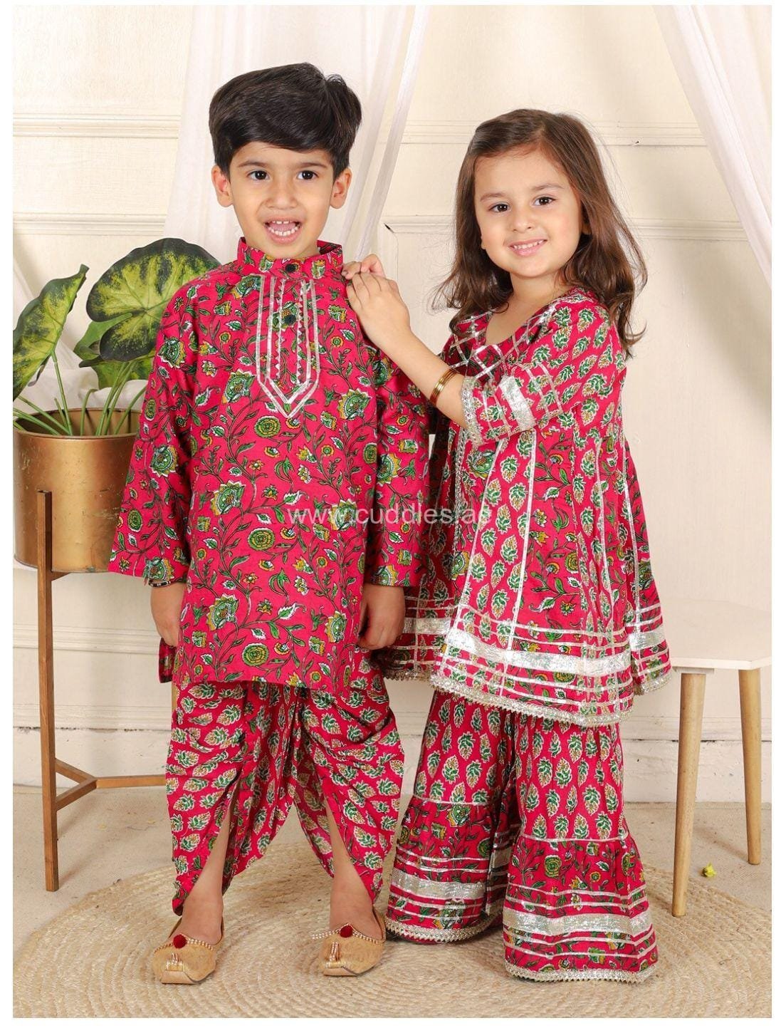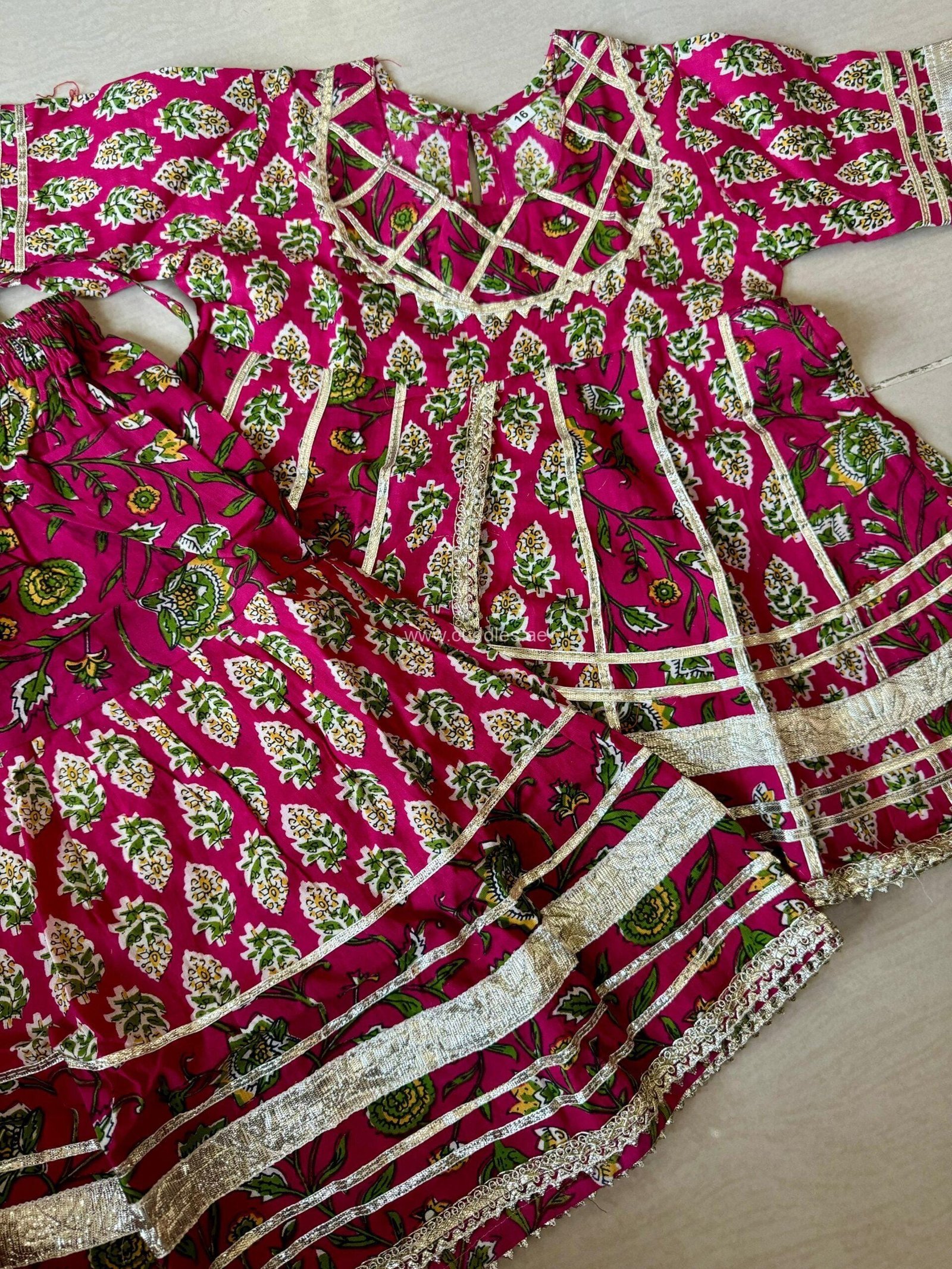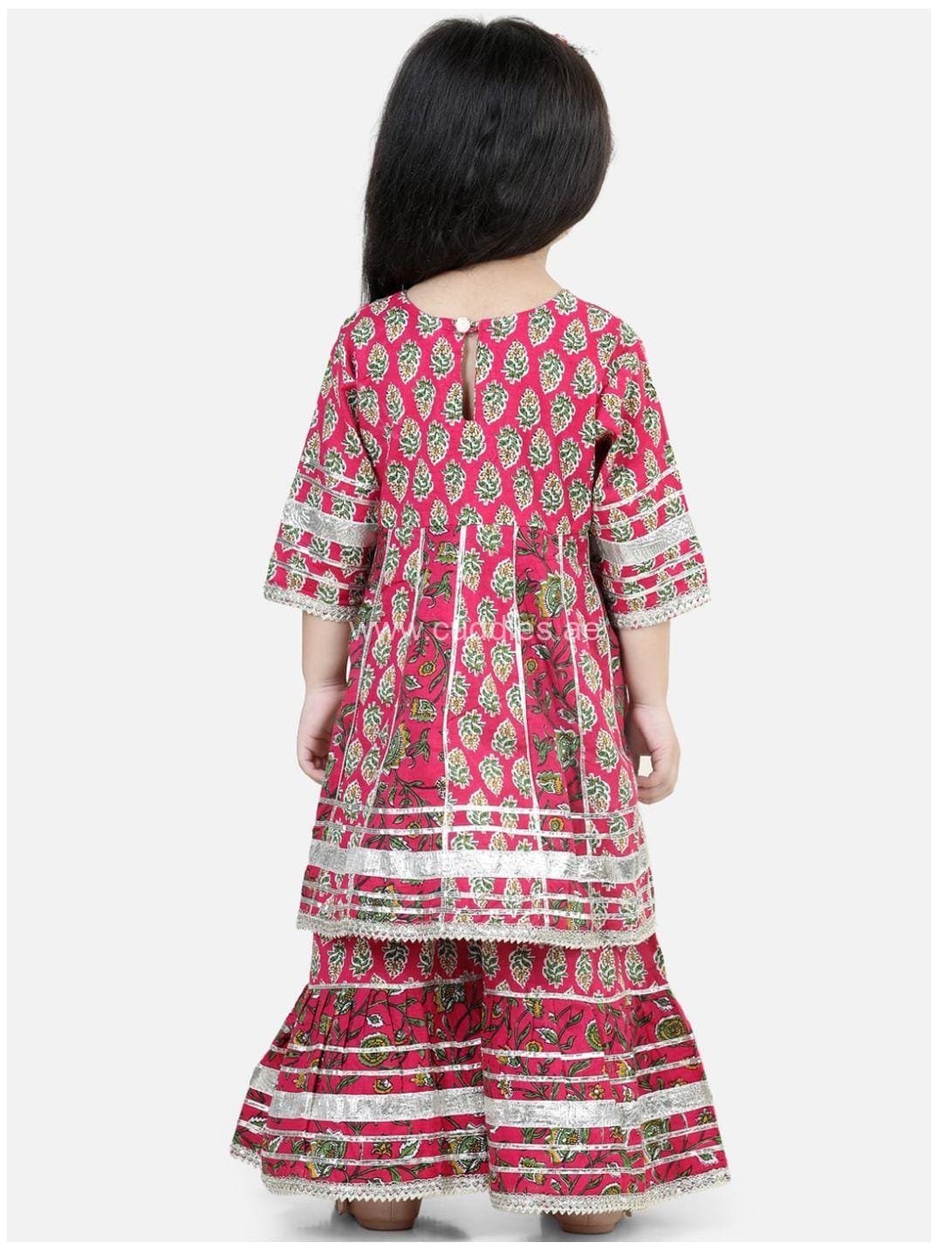 Pure cotton Floral printed round neck, 3/4 th length sleeves, knee length, gota lace detailed Kurta paired with comfortable Sharara pants with elasticated waistband