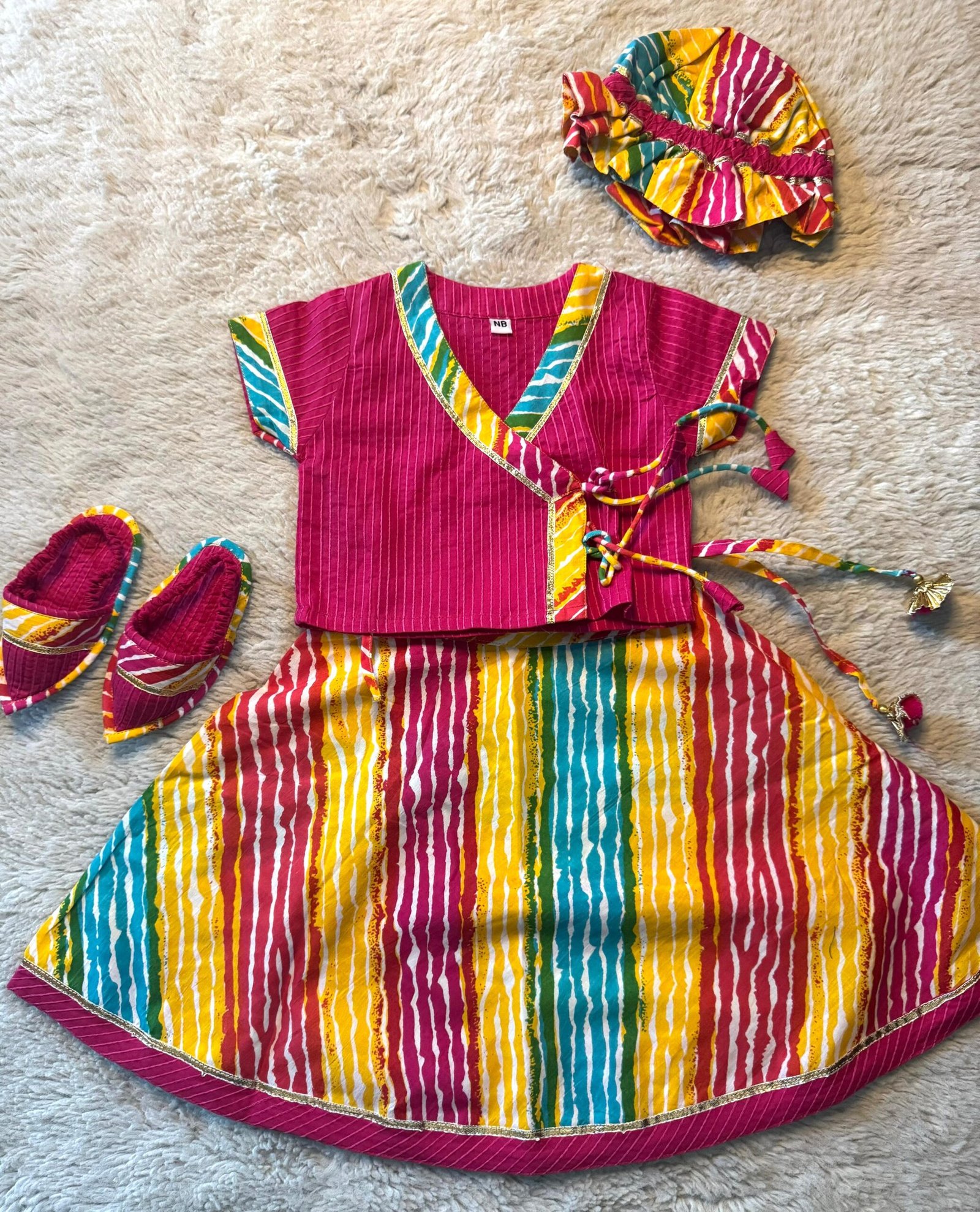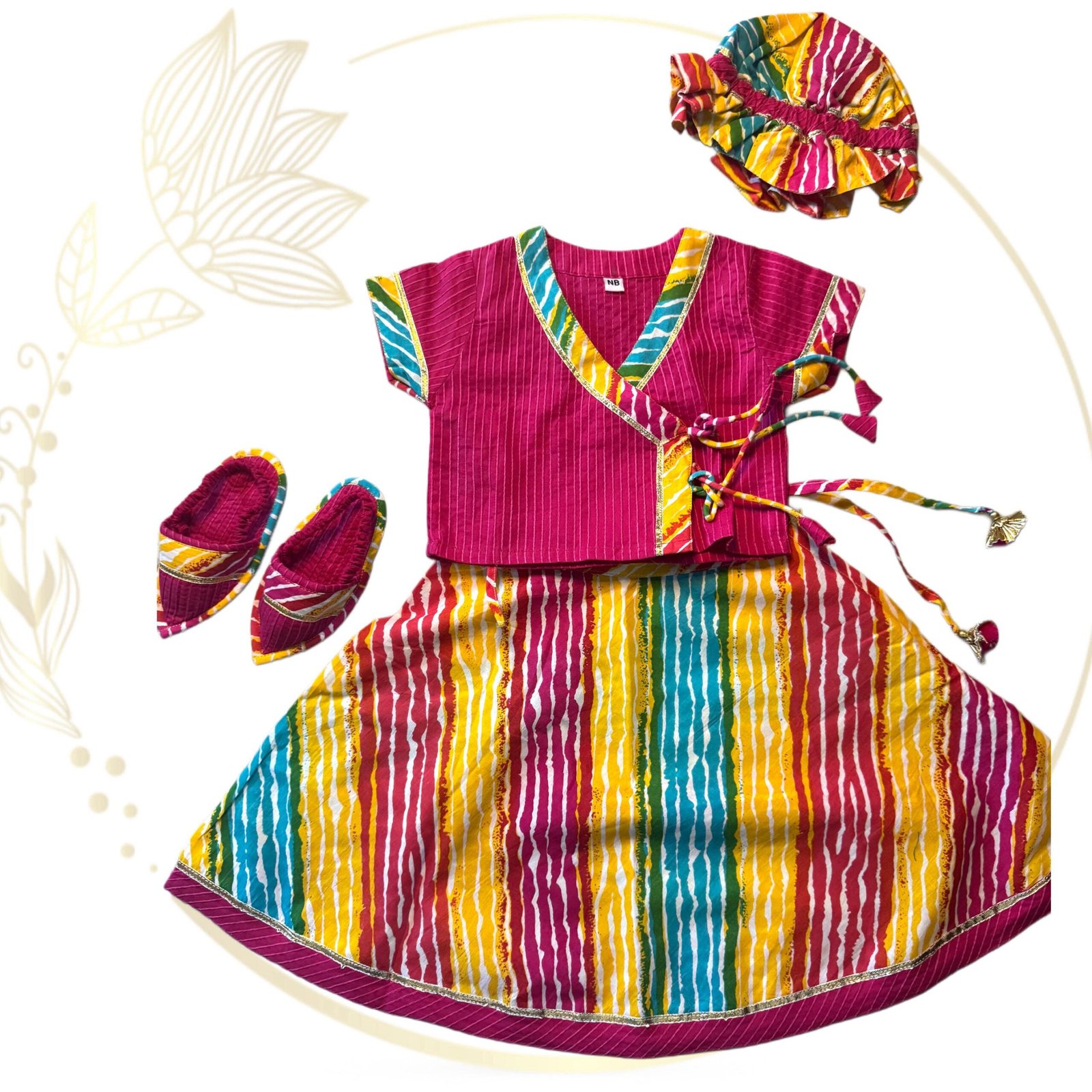 Jaamna set includes: Angrakha Choli, Lehenga , along with Cap and Booties