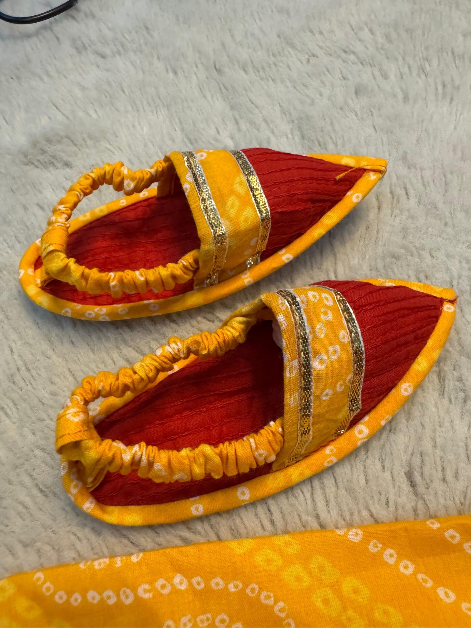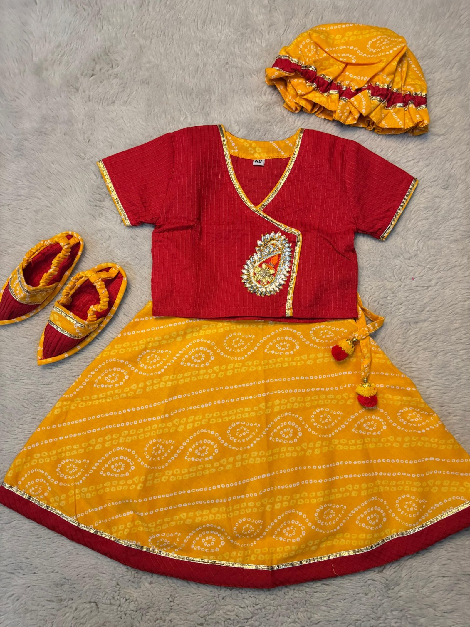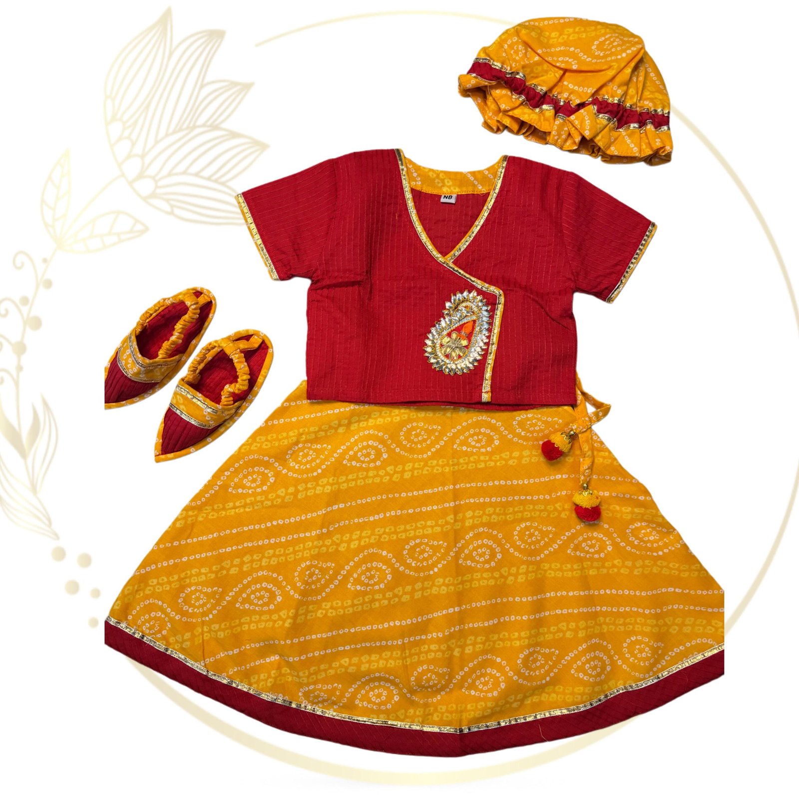 Jaamna set includes: Angrakha Choli, Lehenga , along with Cap and Booties